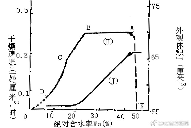 上圖中A-B就是等速干燥階段,此時(shí)水分自生坯外表面的連續(xù)水膜蒸發(fā),內(nèi)部水分不斷補(bǔ)充,內(nèi)、外擴(kuò)散速度相等,干燥速率固定不變。隨著含水率降低,顆粒在水的表面張力作用下被拉近,生坯逐漸收縮,收縮的體積相當(dāng)于排除水的體積,因此該階段應(yīng)使生坯表面溫度均勻、不變。